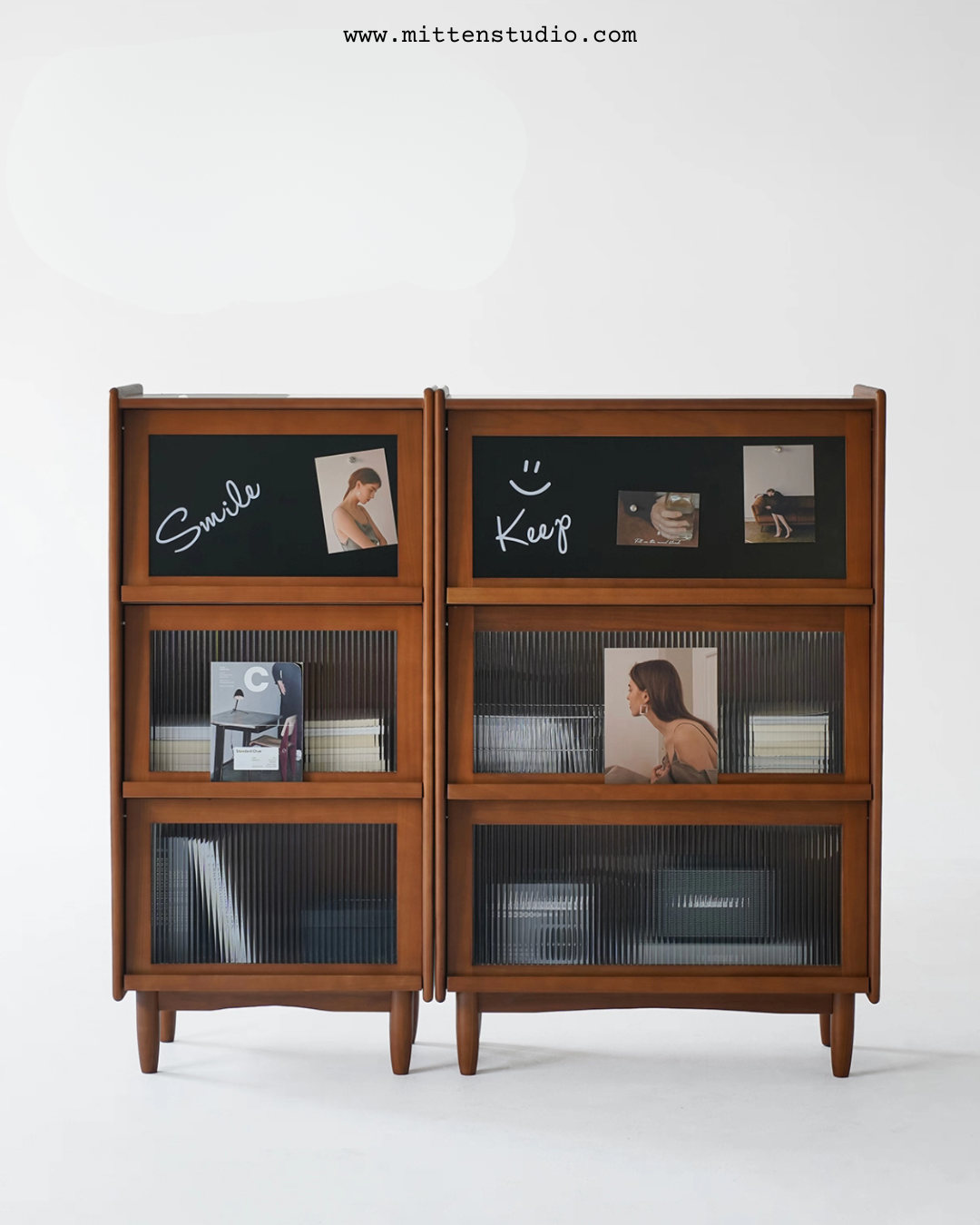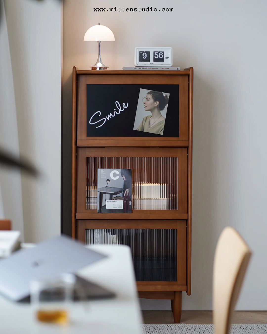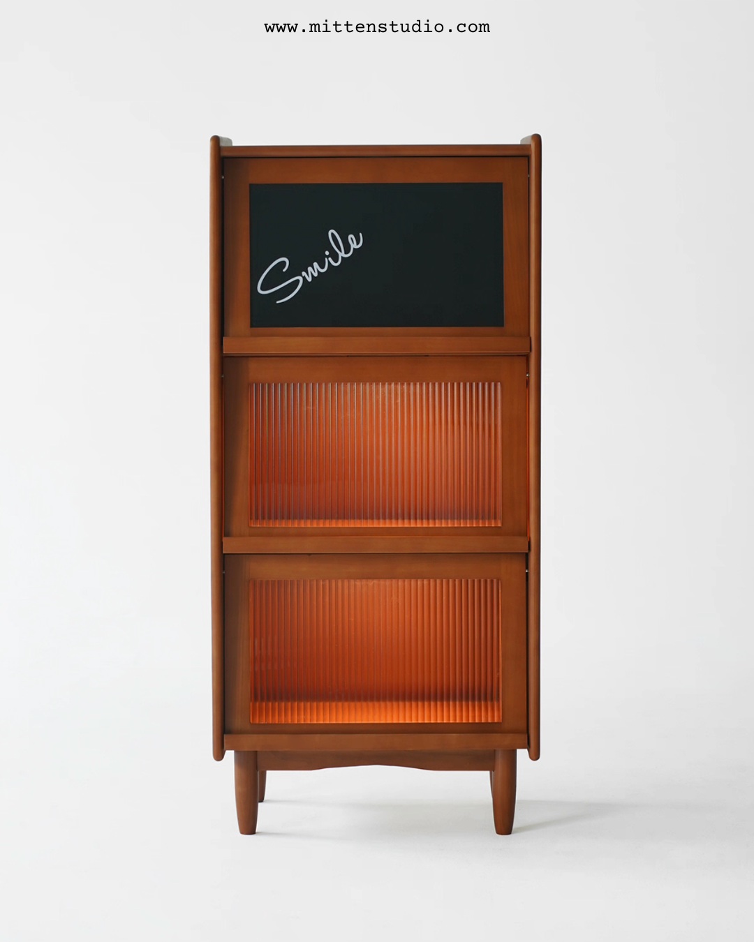Black Cherry Cabinet ตู้ไม้มัลติฟังก์ชั่นสไตล์คาเฟ่อบอุ่นใบนี้โดดเด่นด้วยดีไซน์เรียบง่ายแต่มีเอกลักษณ์ ขนาดพอดีสำหรับวางเข้ามุม ช่วยประหยัดพื้นที่ เหมาะกับบ้านหรือคอนโดที่ต้องการความเป็นระเบียบแต่ยังอบอุ่นในบรรยากาศแบบมินิมอล หน้าบานพิเศษสามารถเปิดยกขึ้นแล้วสอดเก็บเข้าไปด้านในได้อย่างแนบเนียน จึงเลือกได้ว่าจะเปิดโชว์ของตกแต่ง หรือปิดซ่อนของใช้ให้เรียบร้อย ด้านหน้าบานยังมีกระดานดำสำหรับขีดเขียนหรือจดโน้ต เหมาะกับครอบครัวที่มีเด็กให้ใช้เสริมจินตนาการ หรือใช้เขียนเตือนความจำในชีวิตประจำวัน เสริมด้วยกระจกบานลอนที่ช่วยลดความทึบ ทำให้ตู้ดูโปร่งสบายตา ใช้งานได้ทั้งในบ้าน คาเฟ่ หรือห้องทำงานเล็ก ๆ อย่างลงตัว