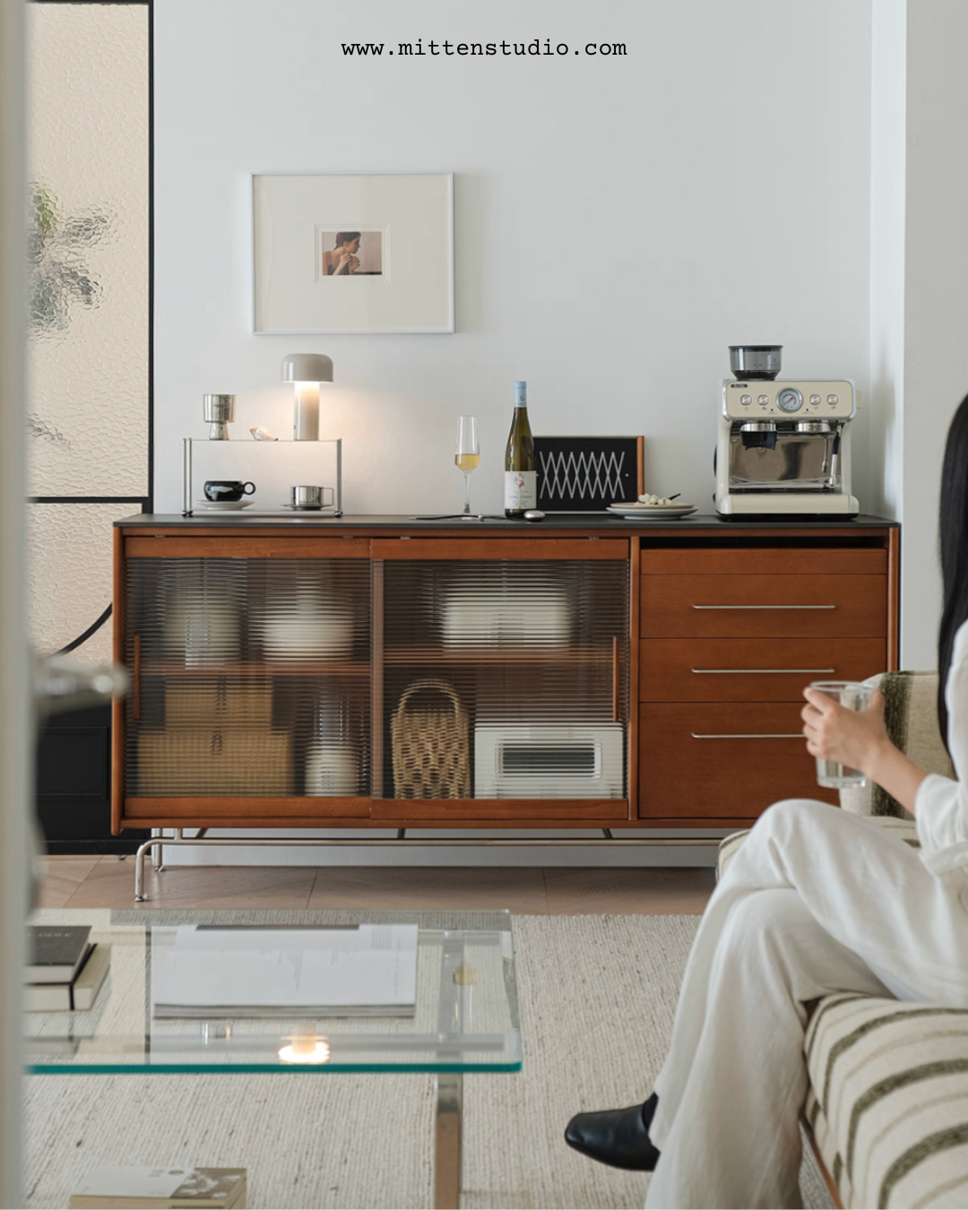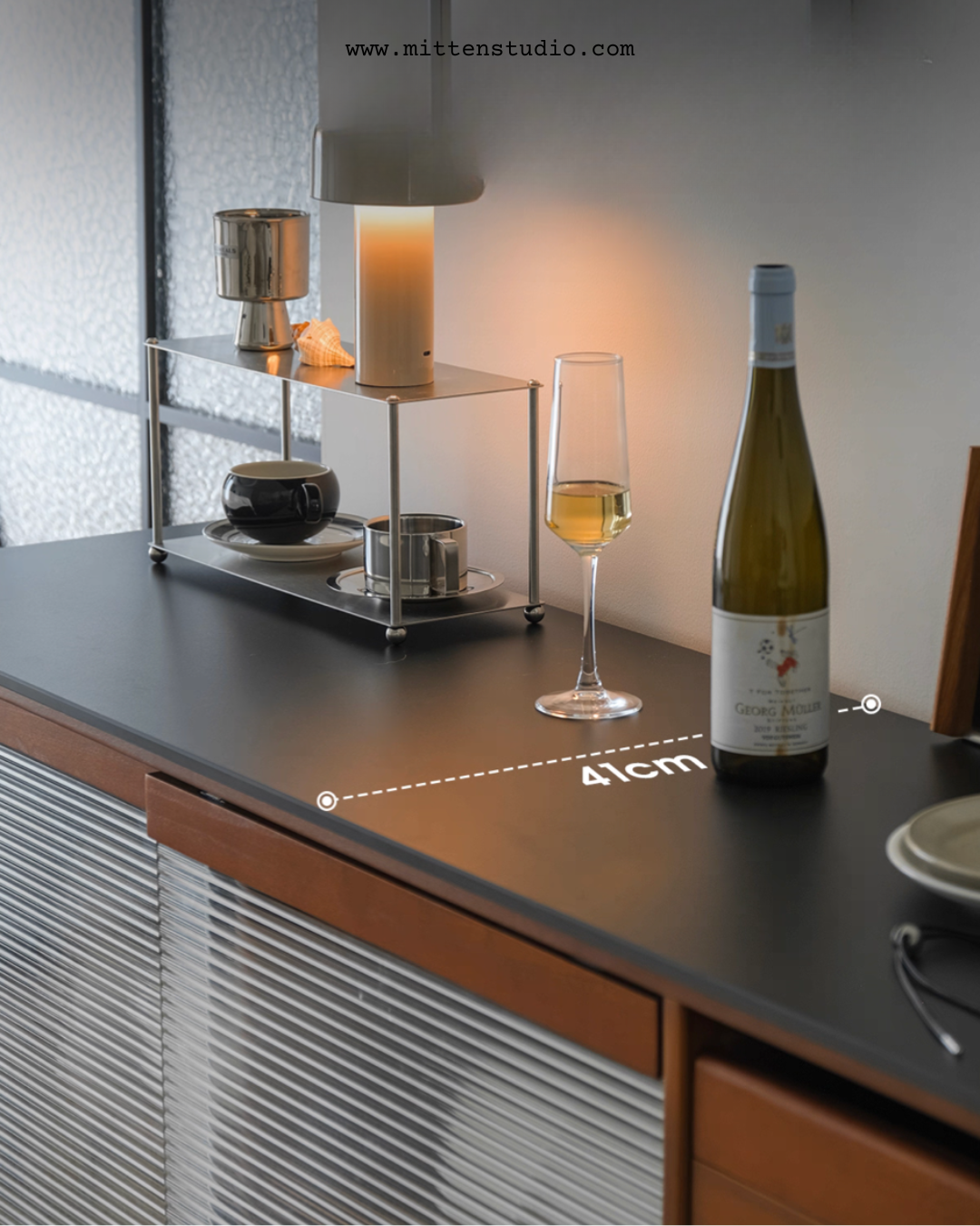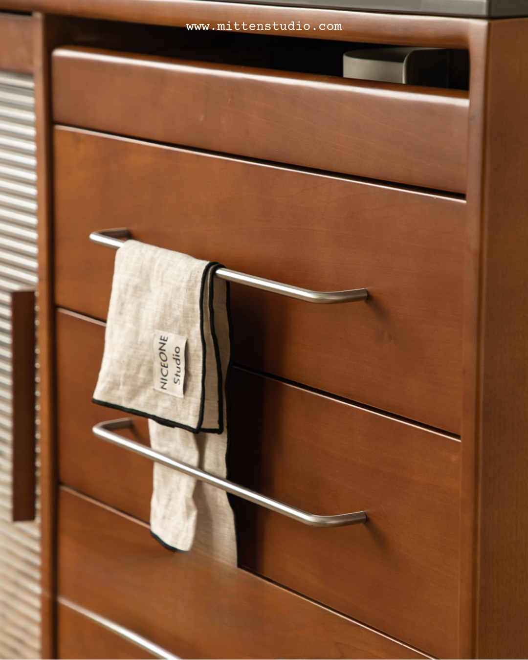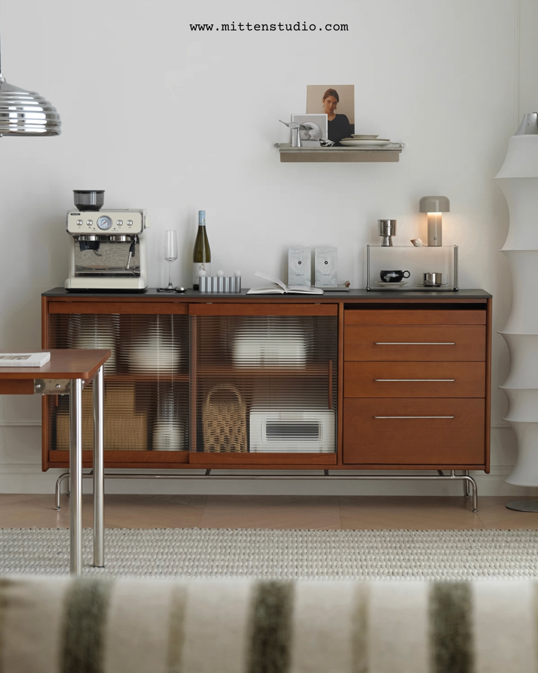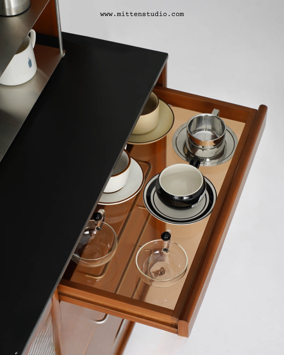 ตัวตู้ด้านขวามีลิ้นชักทั้งหมด4ช่อง โดยช่องด้านบนออกแบบมาให้ใส่ช้อนส้อมต่างๆ และช่องอื่นๆมีไซส์ที่หลากหลาย เพื่อจุดประสงค์การใช้งานที่แตกต่าง ส่วนทางด้านซ้ายของตู้เป็นบานเลื่อนกระจกลอน ที่ช่วยเพิ่มทั้งเรื่องมิติของตู้ ช่วยให้ตู้ดูโปร่งขึ้น และอำพรางในส่วนของภายใน