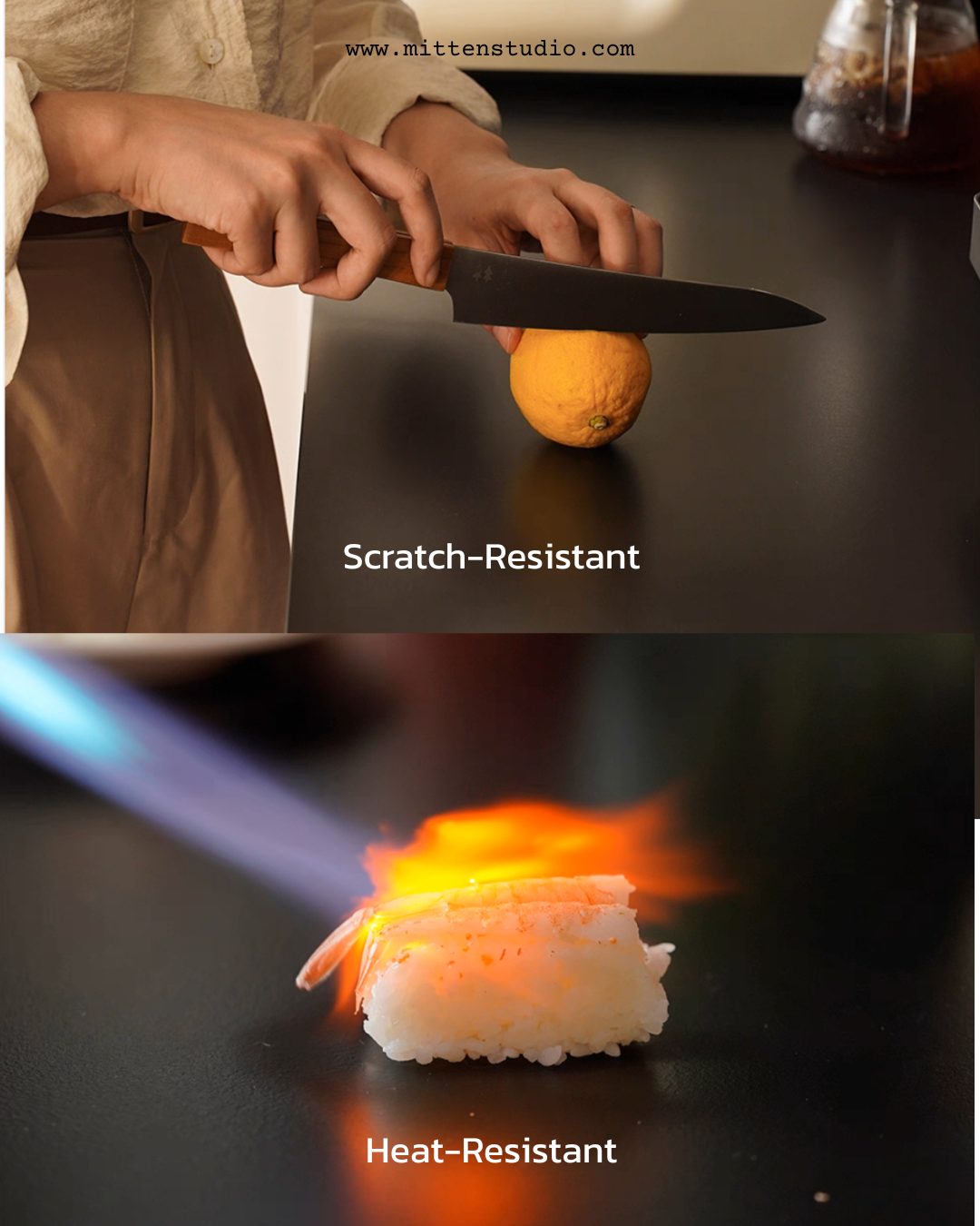 หน้าบานท็อปด้านบนเลือกใช้เป็นหินสังเคราะห์ ที่สามารถทนความร้อน รอยขีดข่วน ได้ดี เหมาะกับการใช้งานหนัก ดูแลทำความสะอาดง่าย โดยไม่ต้องกังวล และยังให้ลุคที่ดูเท่สุขุมขึ้นเมื่อไม้ตัดกับท้อปหินสีดำอีกด้วย