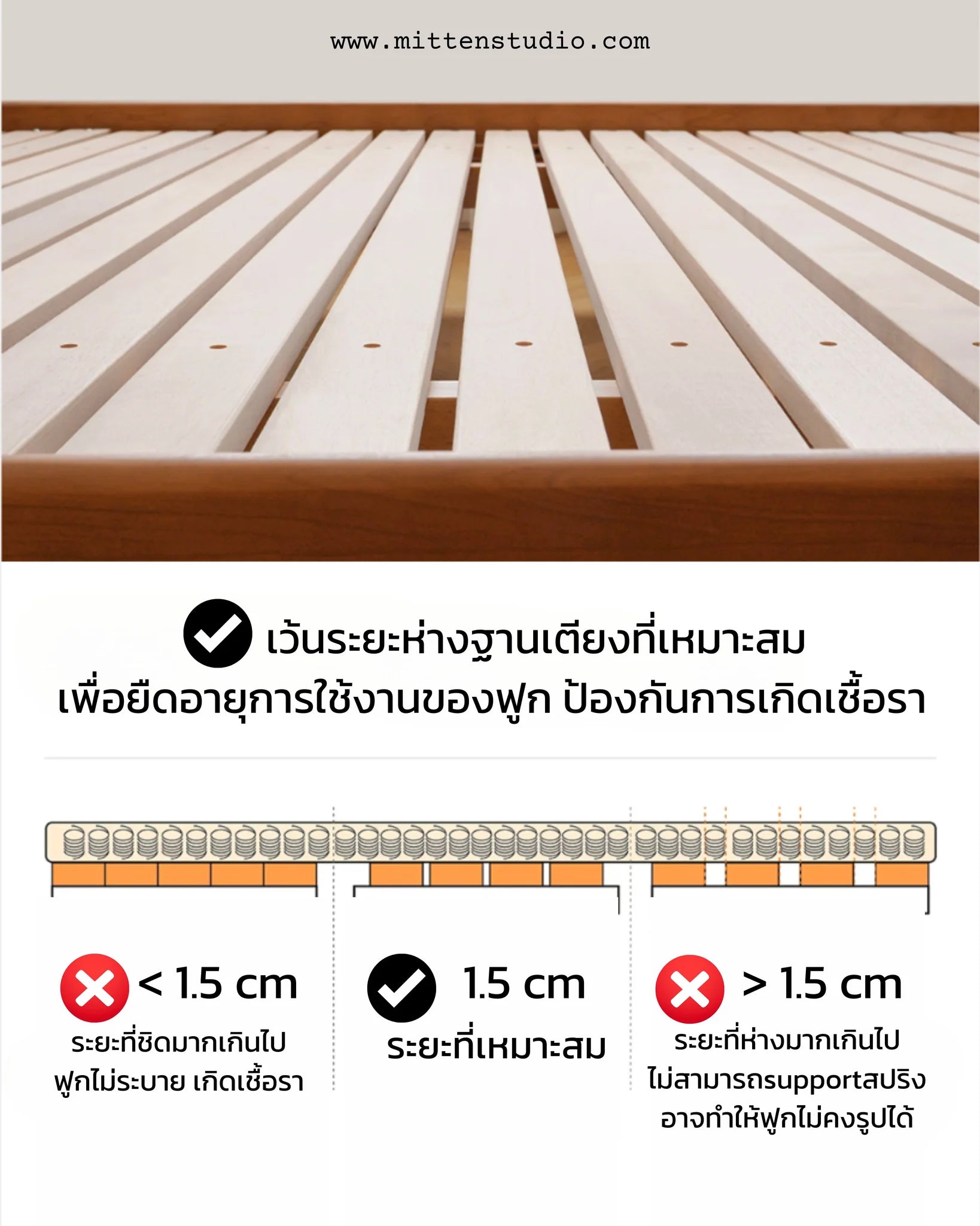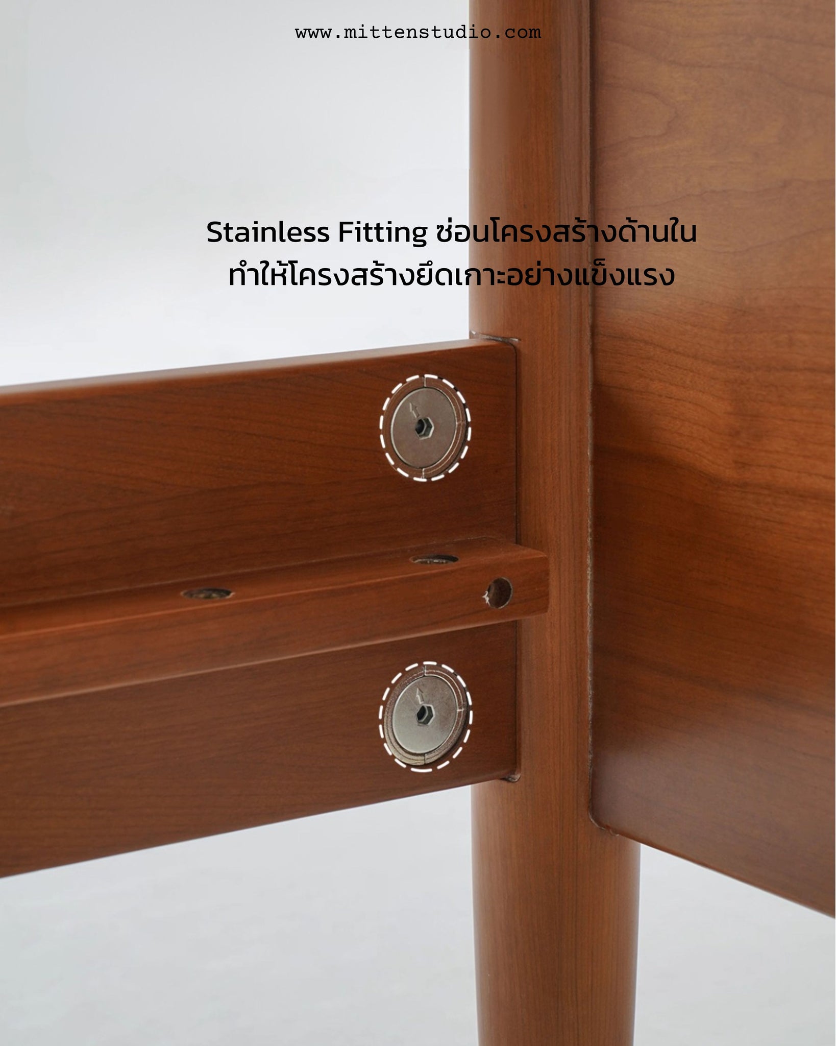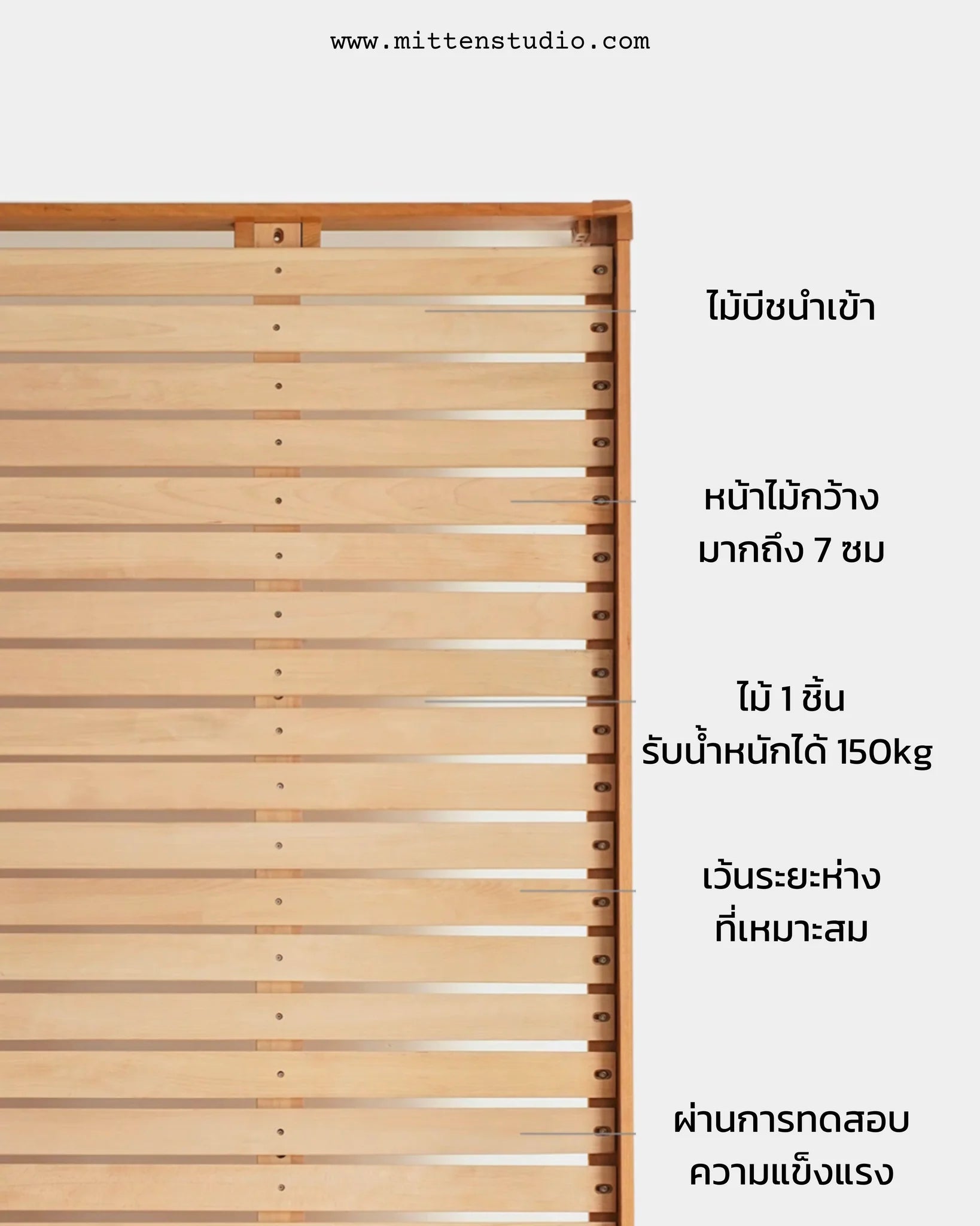 โครงสร้างเตียงไม้เนื้อแข็ง เข้ายึดประกอบกันด้วย High-quality Hardware ที่เป็นการซ่อนโครงสร้างด้านใน ทำให้ทุกชิ้นยึดติดกับได้ดีเป็นพิเศษ จึงมั่นใจเรื่องไร้เสียงรบกวนเมื่อขยับตัว ส่วนของฐานเตียงทุกชิ้นผลิตจากไม้ Beech ซึ่งเป็นไม้เนื้อแข็ง วางในระยะห่างที่เหมาะสม เพื่อให้ฟูกเกิดการระบาย และช่วยsupport สปริงของฟูกเพื่อยืดอายุการใช้งาน โดยแต่ละชิ้นถูกยึดเข้ากับโครงเตียงด้วย น็อตหกเหลี่ยมทั้งหมด 46 ชิ้น รองรับน้ำหนักได้มากถึง400kg และยังช่วยเพิ่มความแข็งแรงให้เตียงโดยรวมทั้งหมด