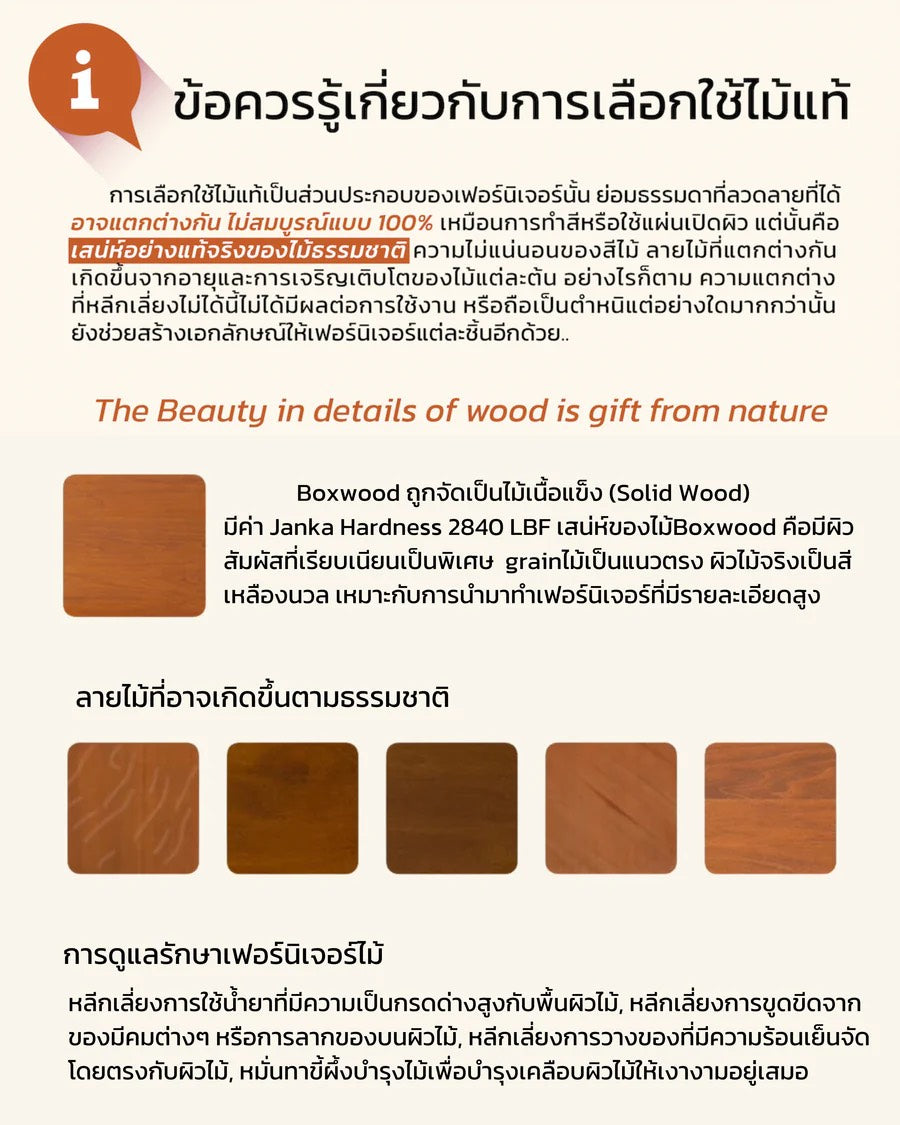 Material วัสดุหลัก: ไม้เนื้อแข็งแท้ (Solid Wood) นำเข้าจาก North America คุณภาพ FAS หรือ ไม้แปรรูปเกรดดีที่สุด ผิวเรียบเนียนไร้ตำหนิ ผ่านการอบแห้งด้วยวิธี Kin Drying และเคลือบผิวด้วย Osmo Polyx Oil ที่มีคุณสมบัติช่วยปกป้องผิวไม้
